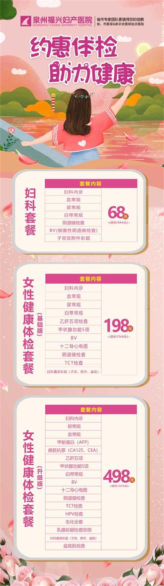 对女性来说,体检是一道不可少的“护身符”通过体检可以早发现、早治疗将50%的病症隐患抵挡在外。有关调查报告显示:在有性生活中,每年查出各种妇科疾患的比例超过70%。不少妇科疾病在早年无症状或症状不明显,发现时可能已经错过最佳治疗时期。因此,定期做妇科检查,是女人关爱最佳的必要措施。要知道,一路相伴到底的只有健康! >>>预约体检