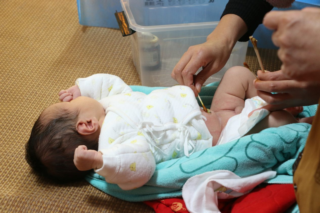 产科医生为产妇检查了伤口恢复情况和子宫复旧情况,产妇恢复的很好。只是宝宝的脐带还没有脱落,手术室护士长随即为宝宝肚脐进行了消毒和系列处理,帮助宝宝脐带能尽早自然脱落。