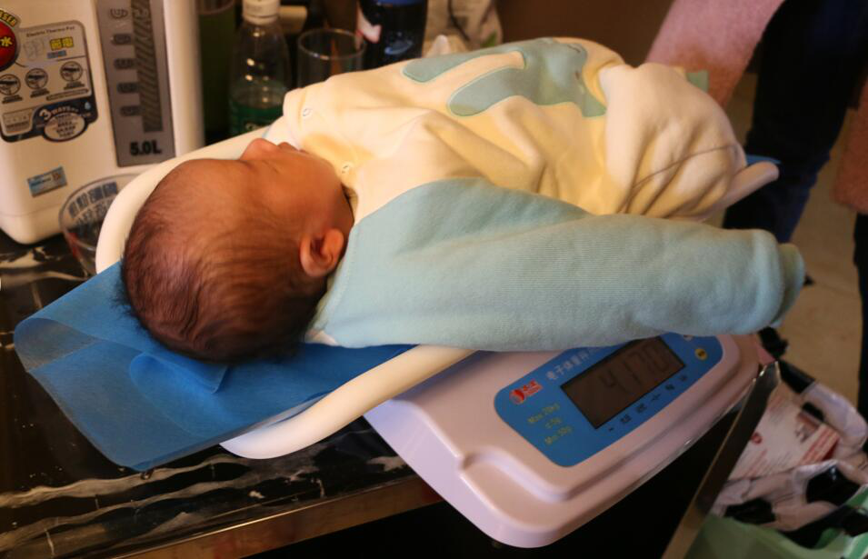新生儿科主任为宝宝进行黄疸监测,宝宝黄疸指数高达15,随后称体重,比起出生时,宝宝还瘦了2两,这让访视团的医生护士长们感到十分心疼。