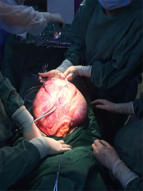 术中,因肌瘤位置较深,与肠管大网膜广泛黏连,剥离过程中容易出血,妇科医师在操作中轻柔细致,尽量在直视下操作,避免造成盆腔脏器、血管及神经的损伤尤其是泌尿系统的损伤。这次手术不仅关系到杨女士的生命,而且如此巨大的肌瘤手术能够顺利摘除,对于主刀的医生以及手术团队,也是一次考验。在手术团队的共同努力下,经过2+小时的手术,11.6斤的阔韧带肌瘤被成功摘除。并行全子宫及双附件切除术。所幸,肌瘤经病理检查为良性病变。