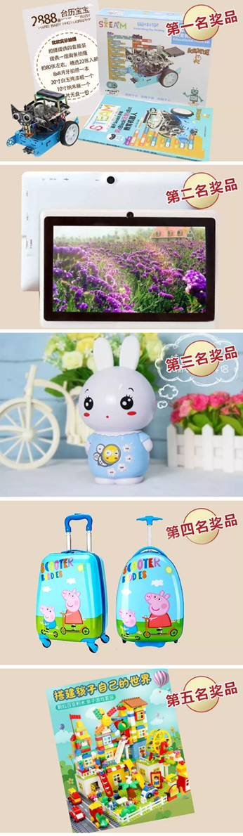 ◎前5名将另获赠编程机器人+价值2888元拍摄套系1份(第1名)、平板学习机(第2名)、儿童故事机(第3名)、儿童拉杆箱(第4名)、百变积木(第5名)