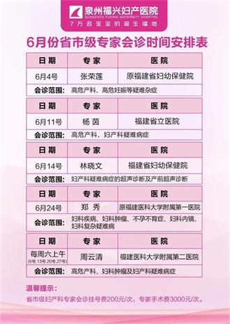 本周,福建省立医院妇产科主任杨茵教授,福建医科大学附属第二医院妇产科主任周云清教授、福建省妇幼保健院超声科林晓文主任,三位省市权威专家,相继莅临泉州福兴妇产医院会诊,让您和宝宝的健康,站上更高起点。