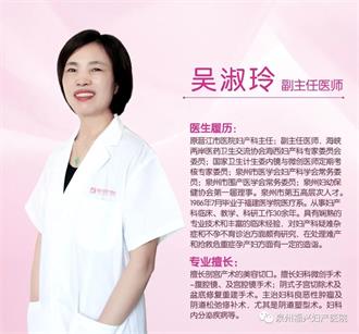 吴淑玲主任,从事妇产科临床、教学、科研工作30余年,在业界享有非常高的知名度。她是原晋江市医院妇产科主任、副主任医师,海峡两岸医药卫生交流协会海西妇产科专家委员会委员;国家卫生计生委内镜与微创医师定期考核专家委员;泉州市医学会妇产科学会常务委员;泉州市围产医学会常务委员;泉州妇幼保健协会第一届理事。泉州市第五高层次人才。