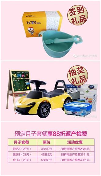 预交分娩、月子套餐全额返还产检费:活动现场预定分娩或月子,就可获得不同额度的产检费返还,最低返还200元,最高返还8800元