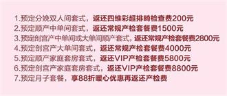 预交分娩、月子套餐全额返还产检费:活动现场预定分娩或月子,就可获得不同额度的产检费返还,最低返还200元,最高返还8800元
