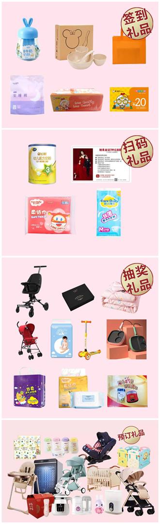 现场抽奖重磅礼:溜娃车+黑面膜一盒+迪斯尼空调被一套、宝宝推车+果c纸尿裤、滑板车+早餐机+拉拉裤、酸奶机+婴儿湿巾+柔纸巾