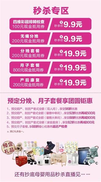 直播间预定分娩中单间以上套式及月子分娩套餐(线下交全额),可享以上优惠,同时可获赠等重磅好礼(多选一)