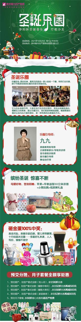 12月25日,泉州福兴妇产医院将开展“圣诞乐圈——孕妈咪圣诞音乐疗愈沙龙”,邀您一起用音乐,奏响音乐疗愈的新方式。帮助孕产妇舒缓情绪、远离焦虑,用一颗健康、平和的心去拥抱新生命。