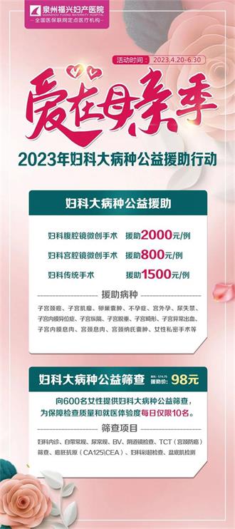 子宫、卵巢是女性特有的生殖器官,孕育下一代及分泌雌性激素是其最重要的功能。但是,当生殖器官生病时,却常给女性带来莫大的困扰。4月20日-6月30日期间,泉州福兴妇产医院开展妇科大病种公益援助行动,妇科腹腔镜微创手术援助2000元/例。